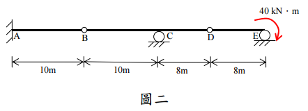 【已刪除】二、如圖二所示連續梁各桿件之 E、I 為固定值。A 為固接支承,B、D 為鉸接,C、E 則 為滾支承。在 E 點承受一順時鐘方向力矩 40 kN.m。請計算各支承反力並繪桿件 A 到 E 彎矩圖,並推導 B、D 點垂直位移與 C、E 點轉角為何?(方法不拘) (25 分)
