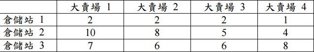 【已刪除】二、鮮洋物流公司擬將一批生鮮海產由其三個冷藏倉儲站運送至全省四個大賣場,三個 倉儲站之供應量為(300, 700, 500)公斤,四個大賣場之需求量為(400, 300, 400, 400) 公斤,三個倉儲站至四個大賣場之運送時間(單位為小時)如下表所示: