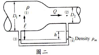 【已刪除】二、流體通過管徑束縮的圓管時壓力會變小,由圖二中給定的條件,推導出點⑵的速度 ( V