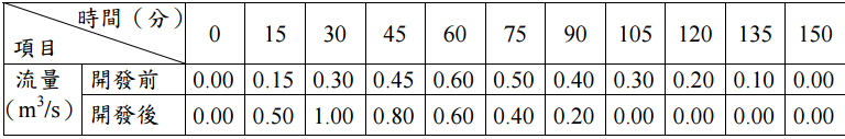 ⑴依逕流總量、洪峰到達時間及基期等,說明為何開發前後有所差異?(6 分)