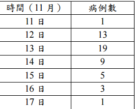 【已刪除】三、某年 11 月某養護中心發生病患下痢疫情,從 11 日起至 17 日流行結束,一共造成 51 個病例,流行狀況如下表。研判此疫情可能是某種微生物單一暴露共同感染所造成, 請推算此微生物何時傳入養護中心,亦即推算此微生物暴露時間(exposure time)? (25 分)