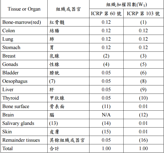 【已刪除】六、依據國際輻射防護委員會(ICRP)第 60 號和第 103 號報告,作答時請於試卷上標示 並填寫表中(1)~(16)之組織或器官對應的中文與組織加權因數 若報告對該項無建議 , 請寫「N/A」代表之。 (16 分)