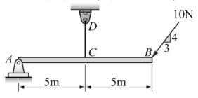 13. 如圖所示構件,CD 為一繩索,試問 A 點之垂直反力應為