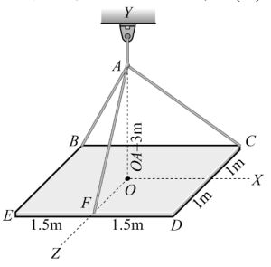 14. 如圖所示,一均勻平板中 600N,三條繩索 AB、AC 與 AF 使此板在一水準位置成一平衡狀態, 試求繩索 AB 之張力為