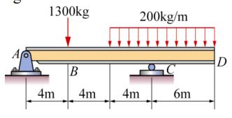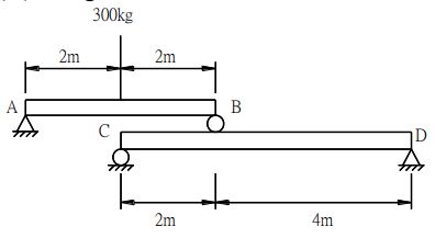 23. 如圖所示之結構,A 點為固定支承,B 為半徑 1m 之滑輪,C 點為鉸接,D 點為錕支承,則 D 點支承反力為