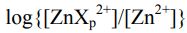⑵當在三杯含有 X 的溶液中分別加入 0.0010 莫耳的 ZnCl2(體積均為一公升)時, 發現各溶液中的[ZnXp 2+]與[Zn2+]的比值與溶液中 X 的平衡濃度呈現出如上圖所示 的關係。估計 p 的數值,並詳述計算過程。(10 分)