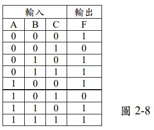 8. 布林代數Y = f(A,B,C)其真值表如圖2-8,下列何者是圖2-8和之積(Product of Sum)的最簡式__________________