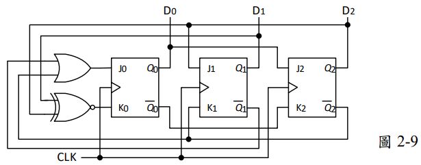 9. 如圖2-9電路圖中,若D2D1D0的初始狀態為001,且CLK適當觸發,電路經過4個時脈週期後,D2D1D0會呈現甚麼狀態?_________