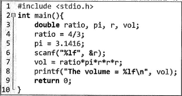 33.圖5的程式是用來計算球體的體積,但計算的結果有錯,請問錯誤出自哪一行?