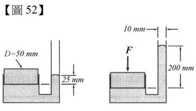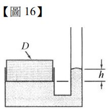 16.【圖 16】表示直徑 D 的活塞置於密度為 ρ的水銀管裝置的平衡狀態,兩側的水銀面高度差為 h。請問活塞的重量為何? (A) (B) (C) (D)