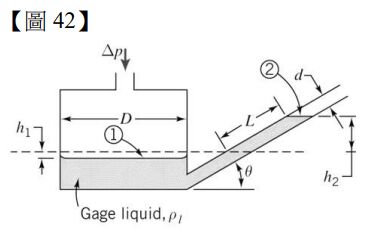 42.【圖 42】表示傾斜管(inclined-tube)液體壓力計(manometer)容器內裝有密度 ρl 的液體(gage liquid),傾斜度 (deflection)為 L,作用的壓力差表示為 △p 。下列何者的分析表示式錯誤? (A) p1 - p2=△p (B) pl=SGl✖ρH2O(at 4℃ ) , SGl 表示液體的比重(specific gravity) (C) △p=ρlg(h2-h1) (D)