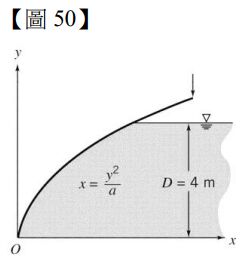 50.如【圖 50】所示的曲面水閘門,向下的外力作用使其平衡,定位樞紐於 O 處,寬度為 5 m。忽略閘門重量,請問作用在閘門的水平水壓力為多少 kN?註:水平力作用在閘門質心(centroid)處,位置為yc = D / 2。(A) 528(B) 441(C) 392(D) 356
