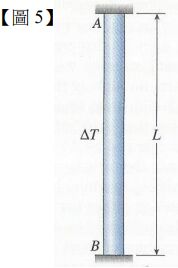 5.一根長度為 L 的桿件的兩個端點被固定如【圖 5】所示,如果桿件的溫度均勻提升了ΔT時,請問桿件中會產生的熱 應力(, thermal stress)為何?(註:E 及 G 為楊氏模數及剪力模數,α為熱膨脹係數(coefficient of thermal expansion), v是波松比)