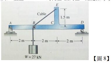 8.一根有垂直臂 CE 的樑 ABCD,如【圖 8】所示,在 A,D 點有簡支撐(simply supported)。一根纜繩(cable)由樑的 E 點通過一個在 B 點的光滑的滑輪(pulley)吊一個重 W=27 kN 的物體。請問在 C 點處樑的彎矩(bending moment)及剪力為何? (註:1 kip = 1,000 pounds-force)