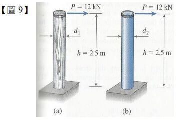 10.接續上題,同樣高為 2.5m 的垂直柱子(vertical post)需要能夠支撐一側向力 P=12 kN 在柱子的上端如【圖 9(b)】,圖 9(b)所示是中空鋁合金的垂直柱子。假設此中空柱子的管壁厚度為管件外徑 d2 的 1/8,如果鋁合金的允許設計彎曲應力 (allowable bending stress)值為 50 MPa,請問鋁合金中空垂直柱子的外徑 d2 至少需要多少?