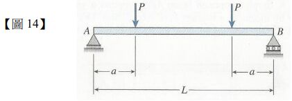 14.一根 simple beam AB 如【圖 14】所示,承受兩相同的集中力負載,請問在兩集中力負載中間的樑結構的剪力(shear force) 及彎曲力距(bending moment)分別為何?