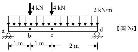 26.如【圖 26】所示,一均勻簡支樑自重為 w=2 kN/m,受到兩個 4 kN 集中力的作用,求 c 點斷面彎矩?