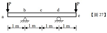 27.如【圖 27】所示,一均勻簡支樑,受到兩個集中力 P 的作用,樑自重可忽略,下列敘述何者錯誤?