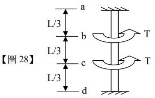 28.如【圖 28】所示,一均勻直桿上下端固定,於三等分處,各受一扭力(Torque),下列敘述何者正確?