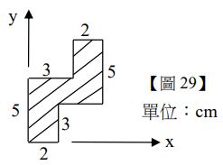 29.如【圖 29】所示,斜線區域為一樑斷面,邊長尺寸標示於圖上,此斷面對 x 軸之面積二次慣量(Area Moment of Inertia) 為何?