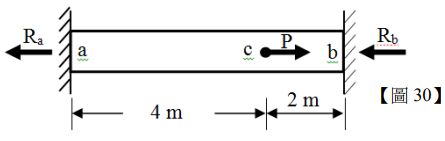 30.如【圖 30】所示,一均勻樑長 6 m,兩端固定,在距右端 2 m 處施加一集中力 P,已知支承反力=1.50 kN,則下 列敘述何者正確?