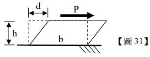 31.一個線性彈性矩形塊體,各邊長為:高、寬 a、長 b,若以力量 P 施於頂面,使其變形並靜止成【圖 31】之形狀,此時相對變形量為 d,d<<h,則該材料之剪力係數(Shear Modulus)為何?