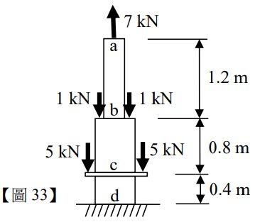 33.一變斷面柱如【圖 33】所示,由 ab 及 bd 兩段組成,其中 ab 段為鋁製材質,彈性係數=70,000 MPa,截面積為=100 mm 2,bd 段為鋼製材質,鋼的彈性係數=200,000 MPa,其截面積=200 mm2。若受到圖示之負載,a 端的垂直位移最 接近下列何者?