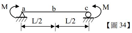 34.如【圖 34】所示,一長度 L 之簡支樑於兩端各受一彎矩 M 之作用, 給定撓曲剛度為 EI,不計樑自重,中點 b 之垂直位移為何?