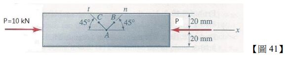 41.一薄矩形試件承受到一軸向水平壓縮負載(P)如【圖 41】所示。在試件中央 AB 及 AC 線段分別代表 n 及 t 的方向,且試件的楊氏彈性模數(E)、波松比()及試件厚度分別為 200 GPa、0.3 及 10 mm,請問試件的正向(extensional)應變為何?