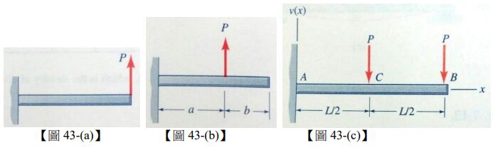 43.由圖 43-(a)及圖 43-(b)分別知道一端固定(clamped)的懸臂樑受到集中負載 P 於自由端點及跨距內距離固定端 x=a 處,懸臂樑的撓曲可分別表示為v(x) =Px26?I(3L − x)及v(x) =Pa26?I(3x − a)當 a ≤ x ≤ L。公式中 EI 是撓曲剛性(flexural rigidity)且 L 為懸臂樑長度。請問當有兩集中力作用於此線性彈性懸臂樑如圖 43-(c)時,樑最大的撓曲變形(deflection)為何?