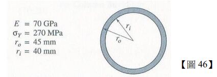 46.一根長 4 m 中空圓柱鋁製的桿件承受壓縮負載,且其端點邊界可以自由轉動(free rotation),桿件材料性質及截面的內外徑尺寸請看【圖 46】。如果抗挫曲損傷(buckling failure)設計的安全係數(FS)是 1.5,請問桿件可以允許的最大壓縮負載(maximum compressive load)為何?