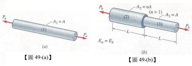 49.兩根長度及彈性模數皆相同的線性彈性桿件如【圖 49】所示,左圖為桿件(a),右圖為桿件(b)。桿件分別承受 及的拉力。依照彈性應變能的觀念,當此兩結構的總變形量(total elongation)相同時,儲存於桿件(b)的應變能及桿件(a)的應變能的比值為何?