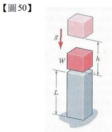 50.一個重 200 lb 的塊狀物自高 h= 20 in.處落下,撞到一根截面積為 4 in2 的方形截面鋁合金桿件(post)的上表面如【圖 50】所示。請問被撞擊桿件(post)最大的壓縮量(maximum shortening)為何?(註:被撞擊桿件(post)的長度 L=2 ft、彈性模數 E=10×103ksi、降伏強度為 60 ksi)