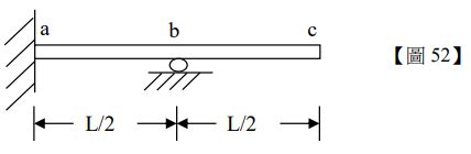 52.如【圖 52】所示,一長度為 L、撓曲剛度為 EI 之均勻彈性樑,左端 a 點處固定,而在跨距中間之 b 點處有一滾支承(Roller),樑身單位長之自重為 w,右端 c 點處因自重所引起之垂直位移為何?