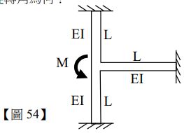 54.如【圖 54】所示,一樑柱系統共有三根桿件,各桿件之撓曲剛度 EI 與長度 L 皆相同,其一端會於一剛性節點,另一端固定。若施加一彎矩 M 於節點上,不計樑柱自重,則該節點之旋轉角為何?
