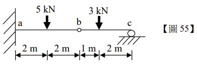 55.有一樑受力如【圖 55】,其撓曲剛度為 EI=3,800 kN-m2,不計樑自重,內鉸接點 b 之垂直位移最接近下列何者?