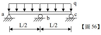 56.如【圖 56】所示,雙跨樑承受強度為 q 之均布載重,撓曲剛度為 EI,不計樑自重,點 b 的支承反力為何?