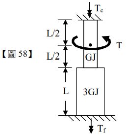 58.如【圖 58】所示,一變斷面軸承由等長 L 而粗細不同之兩段所構成,上半段扭轉剛度為 GJ,下半段轉剛度為 3GJ,天花板端與地板端皆固定,在上半段中點處施加一扭矩 T,天花板與地板所承受的扭矩分別為,下列何者最為接近?