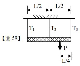 59.如【圖 59】所示,以三根相同桿件等間距懸掛一長 L 之剛性板,並於距右端 L/4 處施加一集中力 P,剛性板可不計自重,若以 T1、T2、T3分別代表由左至右桿件受力,其中最大受力與最小受力之比值應為下列何者?