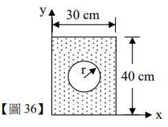 36.如【圖 36】所示,幾何尺寸 30 cm40 cm 之矩形斷面,於中心處開一半徑為 r=9 cm 之圓孔,其面積二次乘慣量(Product Area Moment of Inertia)Ixy 最接近下列何者?