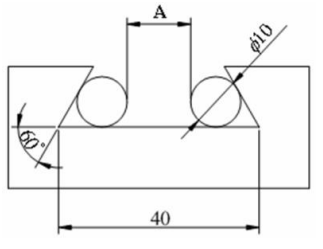 70. 有一 60 度鳩尾形槽如下圖,內肩角距為 40mm,圓桿直徑 10mm,則其 A 值應為(A)11.86mm(B)12.68mm(C)13. 86mm(D)14.68mm。