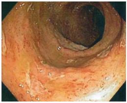 65. 28歲女性因8週的下腹絞痛合併腹瀉病史,接受進一步評估,她每天排便6至10次,其中有一至二次在半 夜,大便特徵為loose to watery with intermittent blood streaking。另外她有噁心及食慾變差現象,但無嘔 吐、發燒,也無服用藥物病史。身體檢查:體溫:37.8℃,血壓100/54 mmHg、脈搏96/min,腹部呈 現diffuse tenderness但無rigidity, guarding或rebound pain。大腸鏡檢查在升結腸、橫結腸及降結腸有如 附圖之發炎病灶,但是terminal ileum及rectum並無發炎現象,下列何者為最可能之診斷?