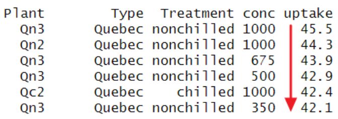 8. 參考附圖 R 語言 CO2 資料集,依照 uptake 欄位由大至小排序,下列何者為正確?(A) order(CO2$uptake) (B) CO2[sort(CO2$uptake), ] (C) CO2[order(CO2$uptake, decreasing = TRUE), ] (D) CO2[sort(CO2$uptake, decreasing = TRUE), ]