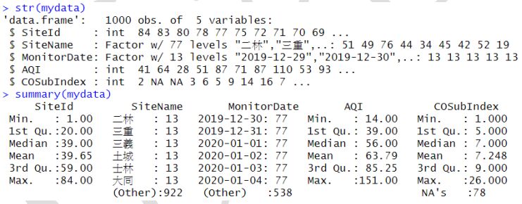 9. 參考附圖,關於 R 語言資料摘要,下列敘述何者為正確? (A) AQI 欄位的中位數為 63.79 (B) class(mydata$MonitorDate)的結果為"Date" (C) SiteId 欄位的最大值為 59.00 (D) COSubIndex 欄位有 78 個 NA 值