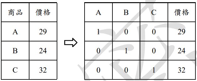 13. 參考附圖,是使用下列何者編碼方式對類別資料進行轉換? (A) 頻率編碼(Frequency Encoding) (B) 序號編碼(Ordinal Encoding) (C) 標籤編碼(Label Encoding) (D) 單熱編碼(One-Hot Encoding)