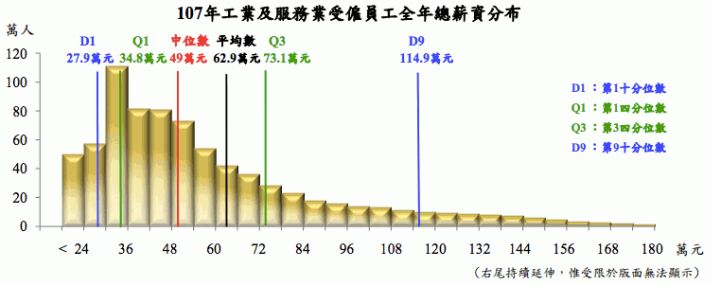 33. 根據主計總處資料,2018 年工業及服務業受僱員工(下稱受僱員工) 全年總薪資如附圖,下列敘述何者「不正確」? (https://www.managertoday.com.tw/articles/view/58998) (A) 有半數受僱員工,全年薪資不高於 49 萬元 (B) 有半數受僱員工,全年薪資不高於 62.9 萬元 (C) 此薪水分布不是左右對稱分布的鐘型曲線,而是左偏型態 (D) 全年薪資達 115 萬元,即可排名在受僱員工前 10%