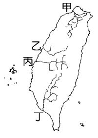 33.下圖是臺灣4條主要河川, 若依甲、乙、丙、丁的順 序排列,下列何者正確? (A)濁水溪、曾文溪、 淡水河、高屏溪 (B)淡水河、濁水溪、 大肚溪、曾文溪 (C)大肚溪、淡水河、 高屏溪、濁水溪 (D)淡水河、大肚溪、 濁水溪、高屏溪