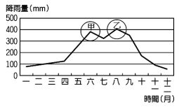 35.下圖的甲、乙是臺灣最重要 的兩個集水時節,甲、乙 分別代表下列何者? (A)甲:西風季、乙:梅雨季 (B)甲:西風季、乙:颱風季 (C)甲:梅雨季、乙:颱風季 (D)甲:西南季風、乙:東北季風