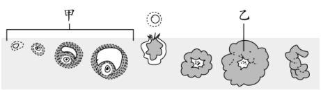6. 附圖為女性卵巢中濾泡細胞發育的過程,根據圖示,下列敘述何者不正確? (A)甲階段 的發育伴隨動情素的分泌 (B)乙的發育會分泌動情素 (C)乙的發育會分泌黃體素 (D) 甲階段相當於子宮的分泌期 。