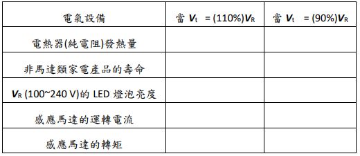 五、線路壓降影響電氣設備的正常運作,下表中Vt為外加電壓、VR是電氣設備的銘牌額定電壓,當 Vt = VR時,設備運作正常;請填寫上電壓變動(±10%)對電氣設備之特性的影響關係。